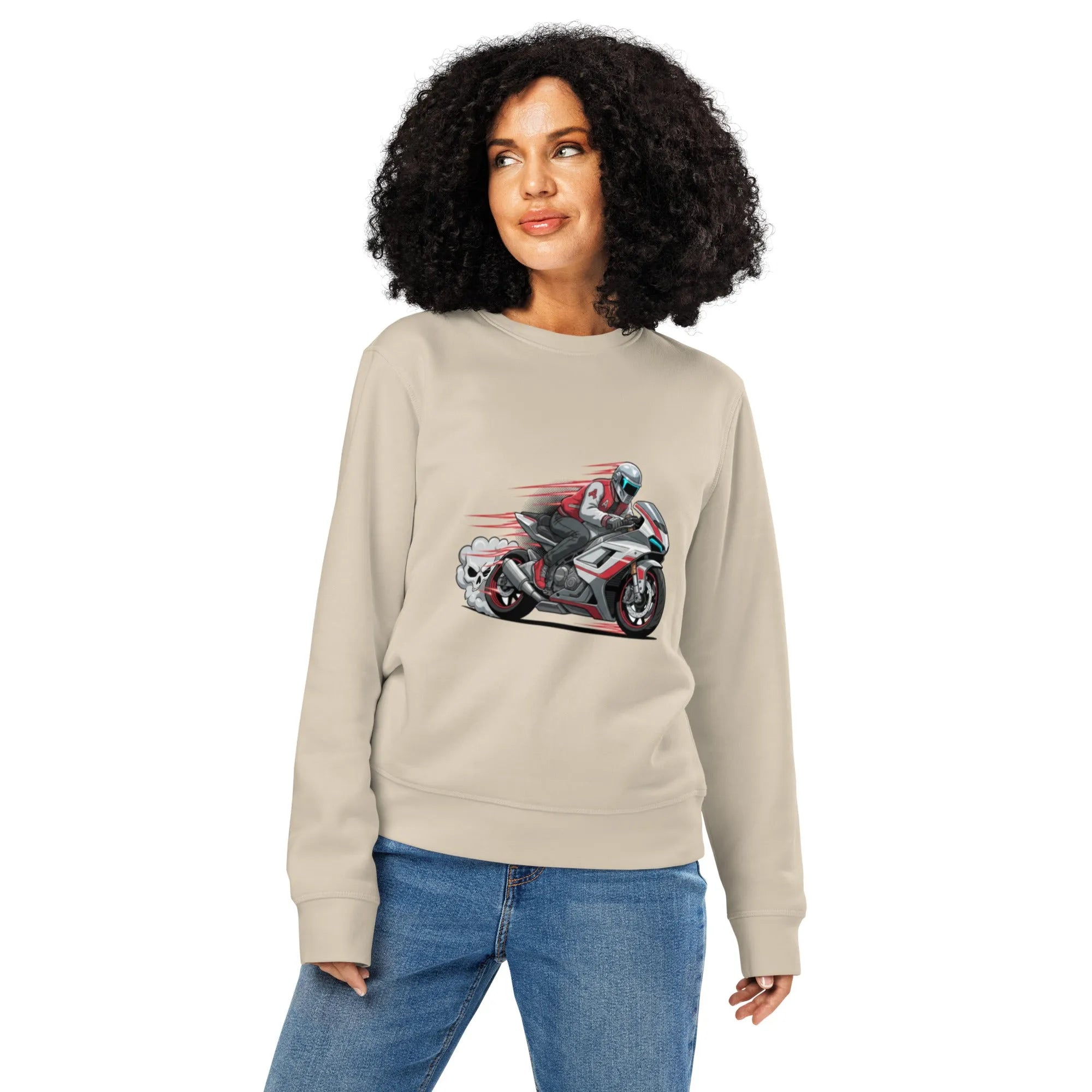 What size should I order for the Retro Moto Racer Organic Sweatshirt | Sustainable Y2K Biker Crewneck?